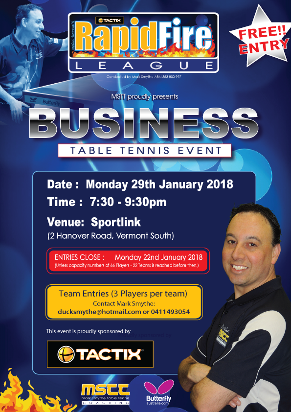 Mark Smythe will again run another Business Event that is FREE OF CHARGE for businesses/companies to participate. It's open for all businesses/companies with players of any level ranging from beginner to advanced in this Rapid Fire League format.